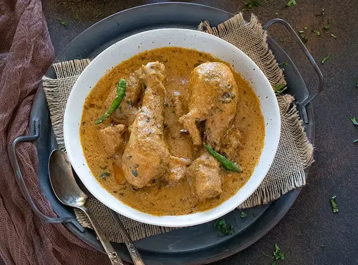 Fresh chicken cooked in onion, yogurt gravy, and finished with cream and nuts. Served with homemade paratha and mint dip.
